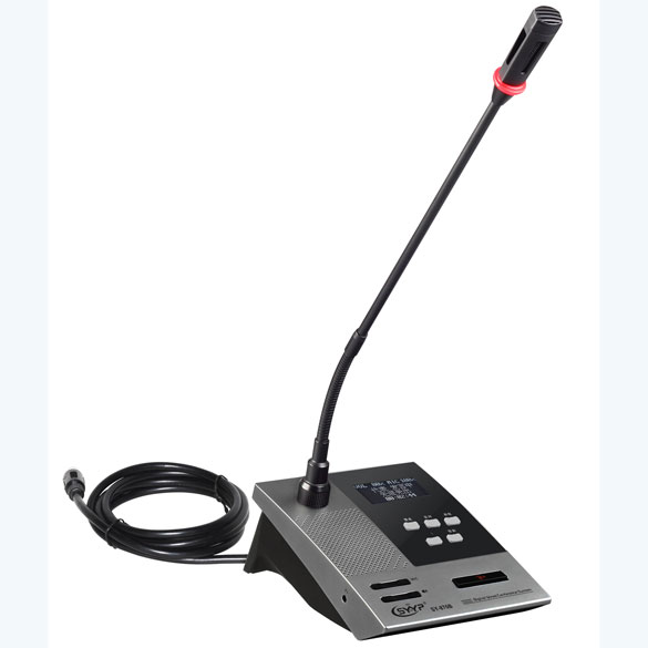 1、智能數字化設計控制電路,功耗低。 2、外置三鍵表決、電子簽到功能。 3、獨特的40CM長管,360度全方位旋轉設計,可拆卸;高保真單指向性電容咪芯,拾音距離遠、聲音還原度好、清晰度高、噪音小。 4、主席單元有優先發言權,可隨時關閉其他列席單元。 5、128X64LCD液晶,顯示單元身份、發言模式、發言狀態、發言時間。 6、優良抗手機干擾能力。 7、無噪音輕觸開關設計,操作靈活; 8、獨有音箱網外觀設計內置揚聲器,可用于會議擴音及播放會議背景音樂。 9、輕觸開關音量控制設計,可調節音量大小。 10、左側設計有3.5音頻輸出,收聽其他列席會議發言內容。 11、會議單元支持熱插拔功能,自帶2.1米8P連接線;手拉手連接模式,安裝簡便,操作靈活。 類型: 電容式 指向性: 單一指向性 頻率響應: 30Hz-18KHz 靈敏度: -43±2db@1KHz 輸入電壓: DC 9V(主機供電) 最小輸入阻抗: 1千歐 新噪比: 68 dB 輸入導線: 2.0M 8P屏蔽線 附件: 防風海綿、2.0M 8P T3M屏蔽線 SY-870B代表單元(下圖)