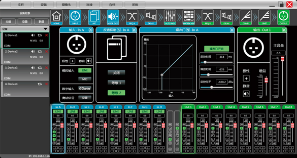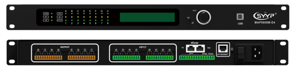 MAP0808M-D4是一款8進(jìn)8出的自動混音媒體矩陣,配備8路模擬輸入和8路模擬輸出,內(nèi)置反饋抑制,自動混音,矩陣混音,均衡器,分配器,壓縮器等DSP功能,支持Dante網(wǎng)絡(luò)音頻功能擴(kuò)展,通過USB免驅(qū)連接電腦軟件控制,RS232,TCP/IP連接中控遠(yuǎn)程控制,適合用在各種場合的擴(kuò)音工程。 ■4路Dante網(wǎng)絡(luò)數(shù)字音頻輸入,4路Dante數(shù)字音頻經(jīng)DSP處理后輸出 ■8路模擬音頻輸入8路模擬音頻輸出,支持麥克風(fēng)輸入和線路輸入自由切換 ■Dante網(wǎng)絡(luò)數(shù)字音頻與模擬音頻可自由切換 ■每路輸入帶48V幻象電源,可以上位機(jī)軟件開關(guān)控制 ■模擬音頻每路輸入帶反饋抑制功能開關(guān),兩檔調(diào)節(jié) ■帶自動混音和矩陣混音功能 ■帶攝像跟蹤功能 ■輸入31段PEQ可調(diào),輸出10段PEQ可調(diào) ■USB免驅(qū)自動連接軟件,支持TCPIP多臺機(jī)器集中管理調(diào)試,配置RS232/RS485中控控制接口,GPIO外擴(kuò)控制接口