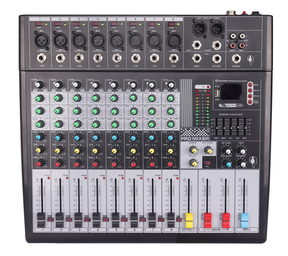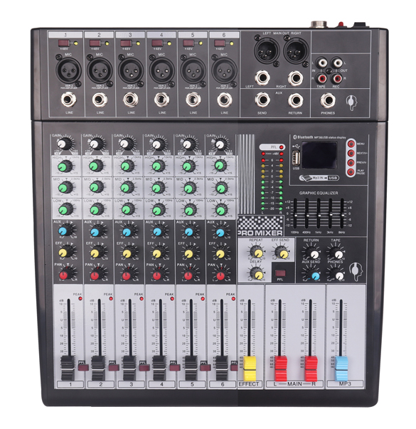 ★兩路麥克風\線路單通道輸入;兩路立體聲信號輸入; ★3波段均衡器,使音色變得溫暖,音樂性極強 ★每聲道有1個后置推桿效果輸送,用于外置效果設備主混音混輸出端,還有獨立的控制室, ★耳機和立體聲CD /磁帶輸出端CD /磁帶輸入可通到主混音或控制室/耳機輸出端用耳機和控制室輸出端可以監聽效果信號經久耐用的 ★高品質的元件和極其牢固的結構,使產品經久耐用 ★48V幻像電源,合適電容話筒,帶耳放、話放、混響功能。