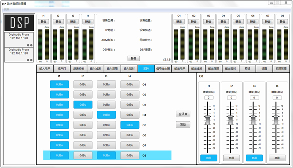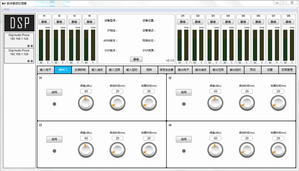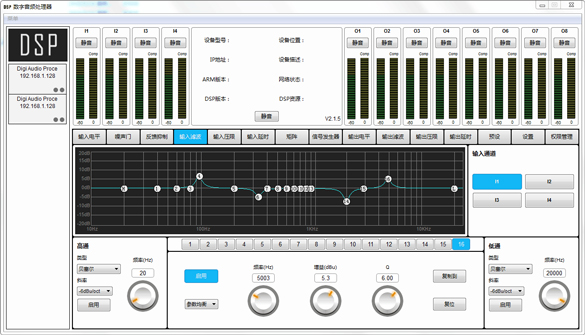 本4進(jìn)8出的音箱處理器,使用最新的第四代SHARC ADSP-21488 400Mhz浮點(diǎn)DSP,具有強(qiáng)大的DSP處理能力。每個(gè)輸入、輸出有16段參數(shù)濾波器,增益控制、噪聲門功能、RMS壓限、內(nèi)置的粉紅/白噪聲發(fā)生器,以及可調(diào)的延時(shí)。分頻器的斜率從6dB/Oct48dB/Oct范圍內(nèi)可選。延時(shí)步進(jìn)精度0.02ms,電平增益精度0.1dBu,滿足現(xiàn)場(chǎng)精細(xì)調(diào)節(jié)。AD-DA動(dòng)態(tài)范圍114dBu。系統(tǒng)動(dòng)態(tài)范圍110dBu。每個(gè)輸入通道包含噪聲門,反饋抑制器,壓限器。100M以太網(wǎng)接口。PC軟件自動(dòng)發(fā)現(xiàn)處理器。32種系統(tǒng)預(yù)設(shè)。通道參數(shù)快速拷貝。 ■可通過(guò)以太網(wǎng)升級(jí)DSP、ARM固件。 ■最大輸入電平 18dBu;最大輸出電平 18dBu;默認(rèn)輸出電平 0dBu。 ■諧波失真THD+N <0.003%;1kHz@+4dBu<0.0035%;1kHz@+10dBm;<0.0035%;20Hz~20kHz@+4dBu。 ■頻率響應(yīng) 20Hz-20kHz, +/-0.2dB。 ■輸入到輸出動(dòng)態(tài)范圍 110dB (無(wú)記權(quán));信噪比 -110dB (無(wú)記權(quán)。 ■ADC動(dòng)態(tài)范圍 CS5361 114dB;DAC動(dòng)態(tài)范圍 CS4382A 114dB。 ■DSP 400Mhz浮點(diǎn) SHARC ADSP-21488。 ■采樣頻率 48K;量化 24Bit;模式存儲(chǔ) 32。 ■壓限器 前后獨(dú)立共12個(gè): 延時(shí)器 輸出1-4 218ms。